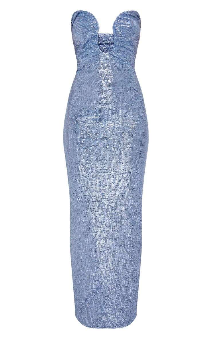 Dare to stand out from the crowd in this statement dress. Featuring a baby blue metallic material with a wire detail and a maxi length. Wear with your fave heels and minimal accessories for a show-stopping look.