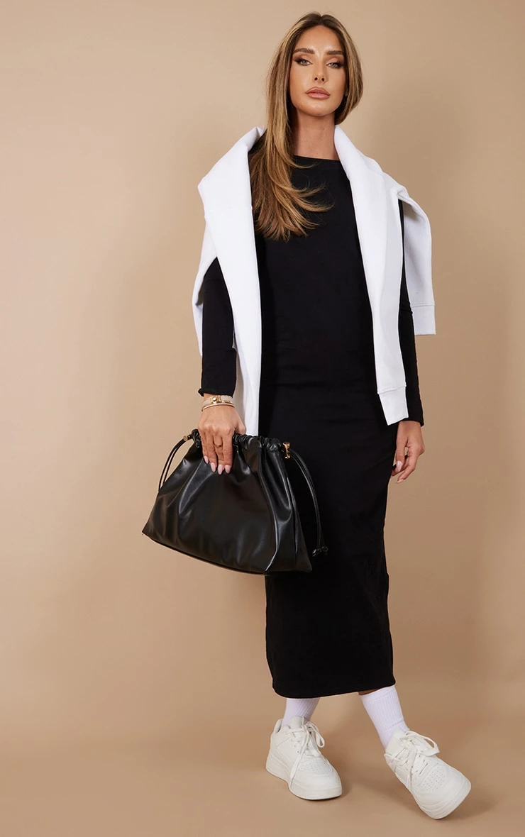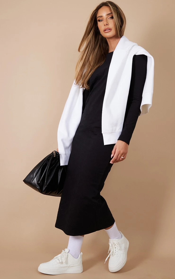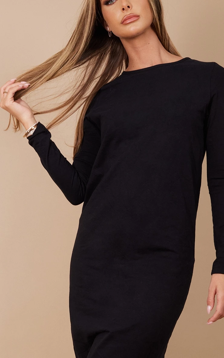Add some seriously chic vibes to your new season wardrobe with this black cotton oversized long sleeve maxi dress. This dress is perfect for effortless AM to PM styling. It features a black cotton material with long sleeves and an oversized fit, we’re in love. This flattering maxi length is sure to help you express your glam side. Pair this unreal dress with your fave sneakers, an oversized Sweatshirt and a clutch bag for a fool proof finish.