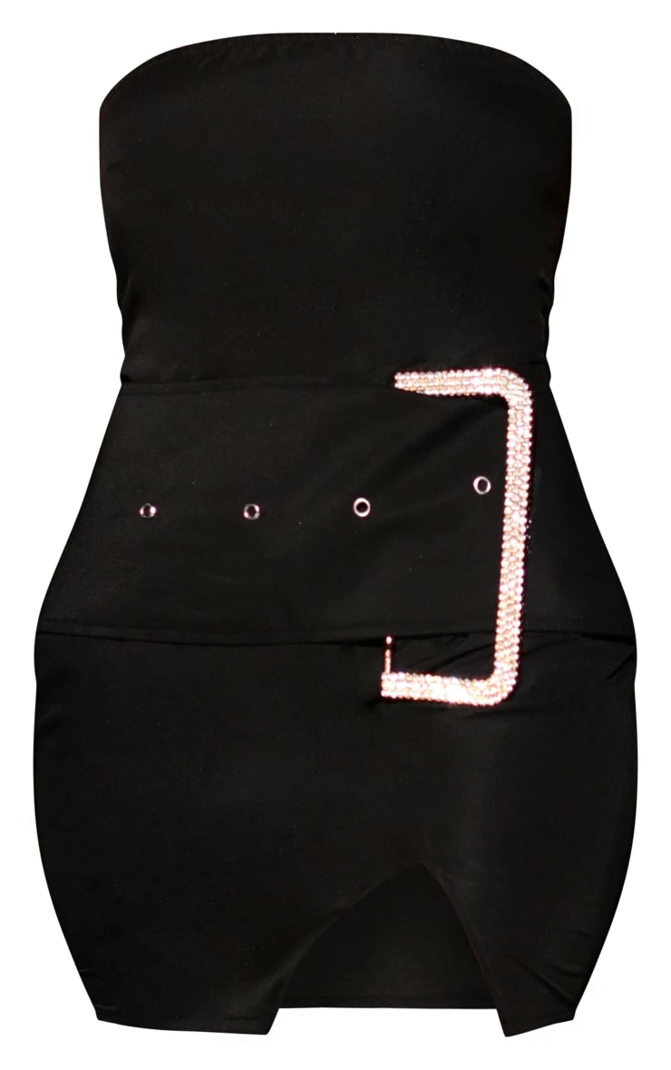 Inject some confidence into your weekend wardrobe with this bodycon dress. Featuring a black material with a diamante buckle design and a bandeau neckline. Style it with your fave accessories and some clear heels for a dreamy vibe.