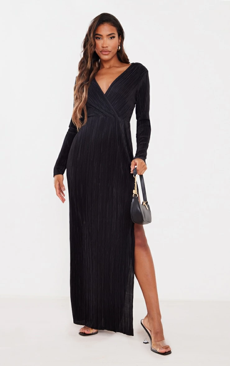 Your what to wear dilemmas are finally sorted with this dress doll. Featuring a black plisse material with a wrap design and a maxi length, we’re in love. Wear with clear high heels and chunky gold hoops for a look we can’t get enough of.