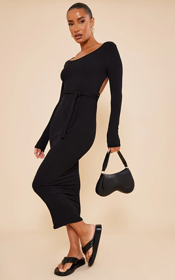 Get maxing out your wardrobe with this stunning dress. Featuring a black ribbed material with open tie-back detailing and a midaxi length. Team with a pair of chunky boots and a scarf for the ultimate chic look.