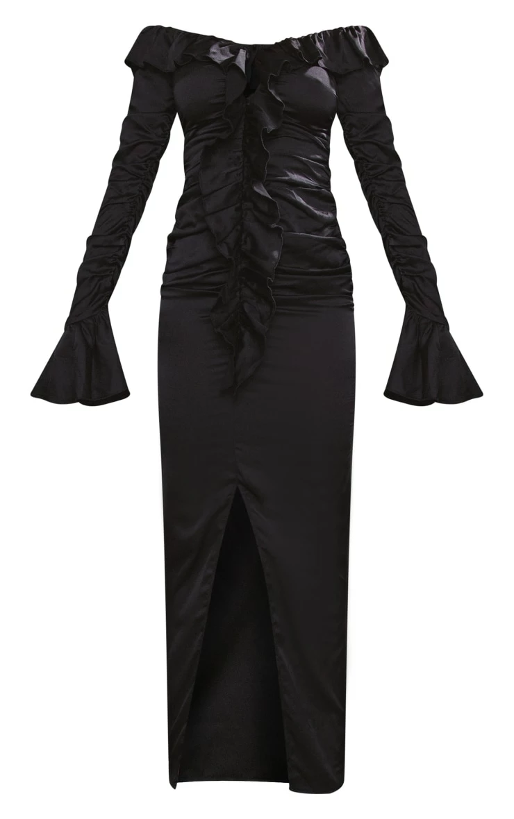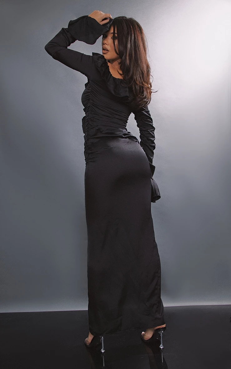 Make jaws drop this season with this staple maxi dress. Featuring a black material with a ruffle design, a ruched detailing, long sleeves and a flattering fit, we are in love. Wear with high heels, accessories and a shoulder bag to complete the look.