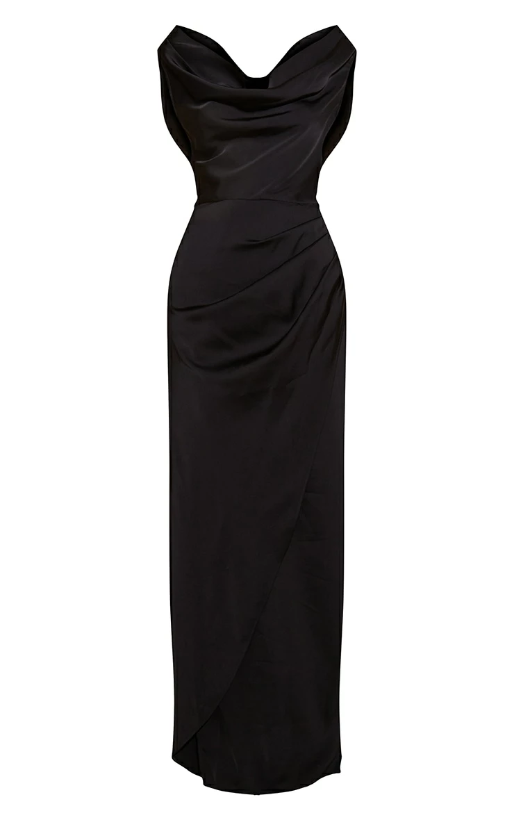 Your occasion look is complete with this luxe maxi dress. Featuring a black satin material with a cowl neckline, a draped design and a maxi length, we’re obsessed. Style with heels, a mini bag and accessories for a look that will have all eyes on you.