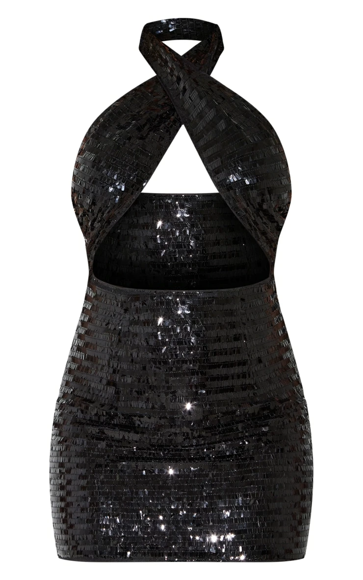Let your inner sparkle shine this weekend with this bodycon dress. Featuring a black sequin material with a cross halterneck design and a figure-flattering fit. Team it with strappy heels and statement earrings for a look we’re loving.