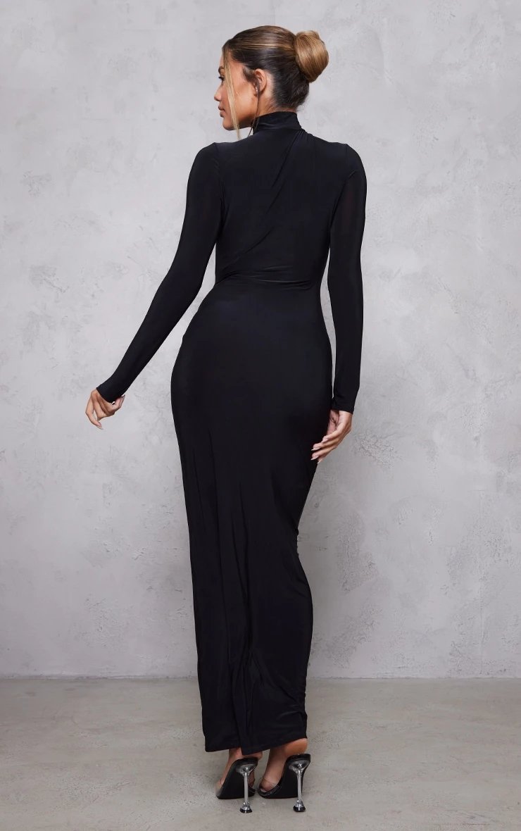 Amp up the attitude with this black slinky cut out ruched waist long sleeve maxi dress. We know you won’t be able to resist this women’s dress. Made using a chic black material with a figure-enhancing fit that is perfect for showing off your shape, what more could you ask for? This dress will not disappoint. Wear with high heels, accessories and a shoulder bag to bring the whole look together.