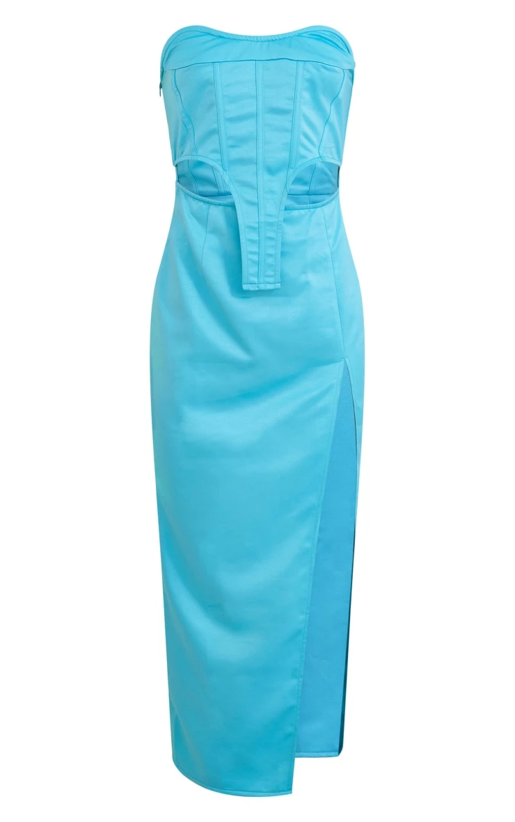 Stand out from the rest in this blue satin bandeau corset stirrup hem split midaxi dress. This unreal dress is brought to you in a blue satin material for a luxe feel we are obsessing over. In a bandeau design and a stirrup hem, this midaxi dress is a must have, we are obsessed. Style with some of your highest heels and your fave accessories to complete the look we are loving.