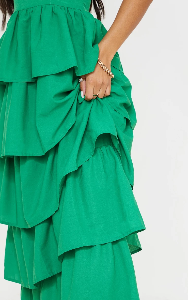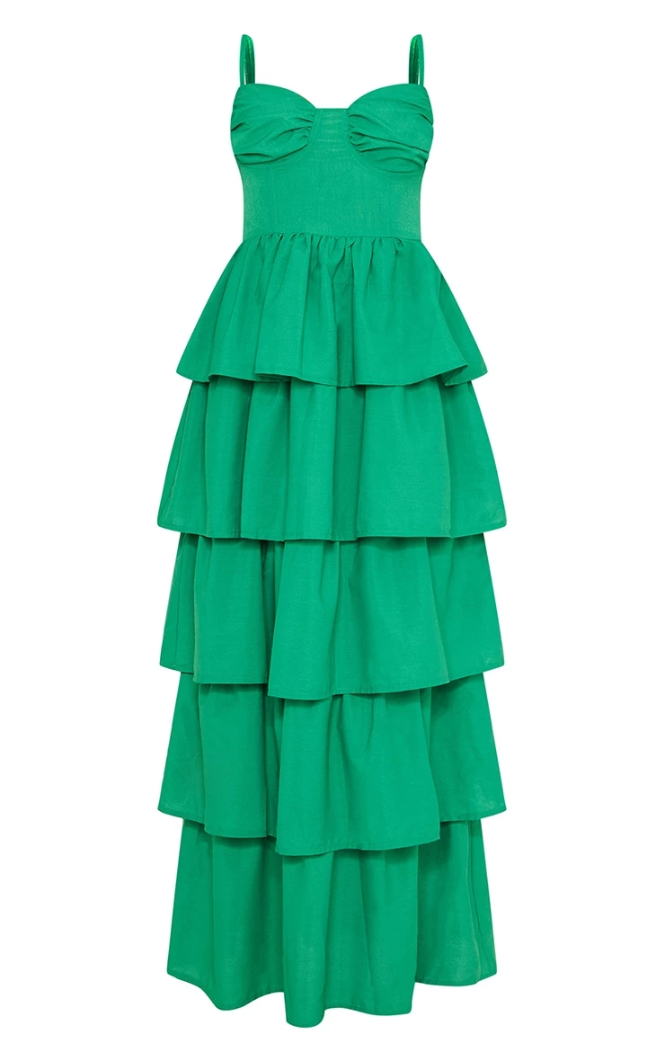 Get totally occasion ready in this stunning maxi dress doll. Featuring a bright green fabric with cup detailing and a tiered design, what’s not to love? Finish off the look with statement accessories and barely there heels for a look we’re loving.