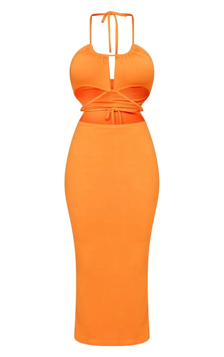 Get ready to serve some serious style with this dress doll. Featuring a recycled bright orange thick rib material with a tie waist and a halterneck design, what’s not to love? For some extra likes this season be sure to style with strappy heels and gold accessories.