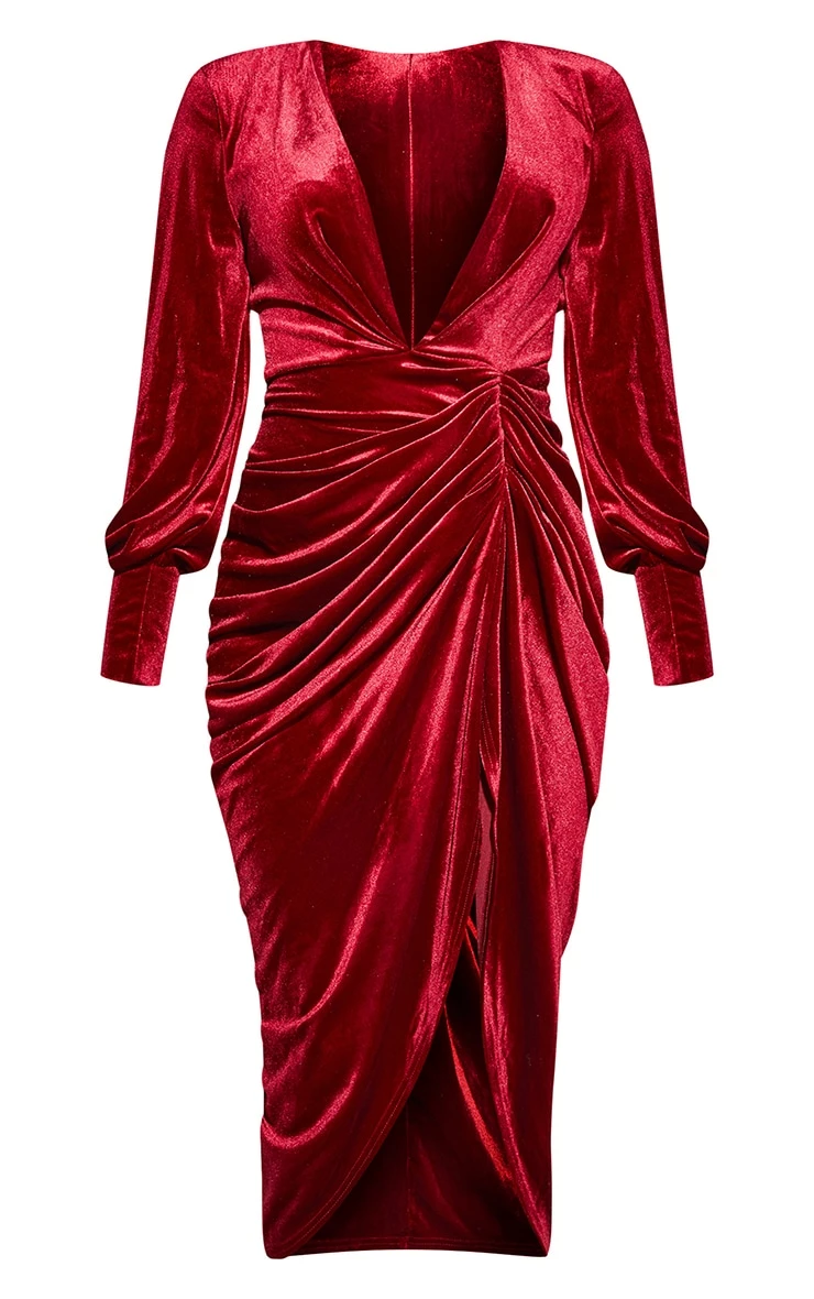 Make a statement this season with this dress doll. Featuring a burgundy velvet material with a plunge neckline and a draped design. Style with clear heels and a clutch bag for a look we’re obsessing over.