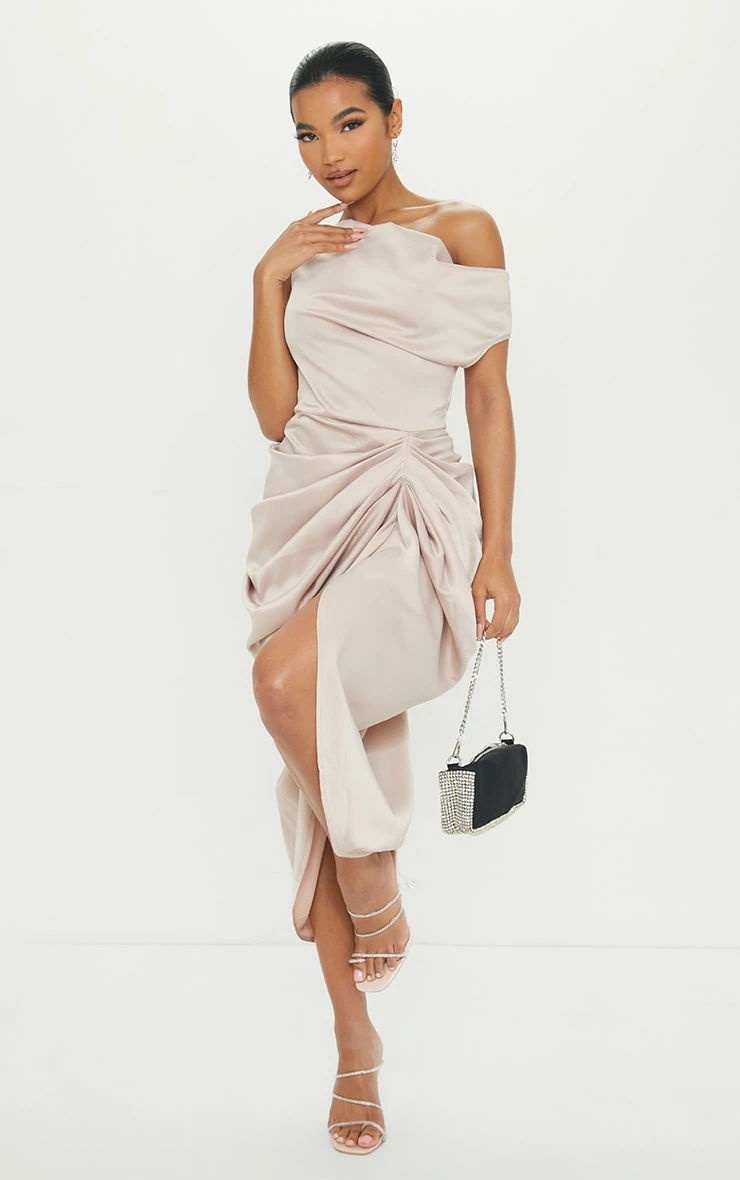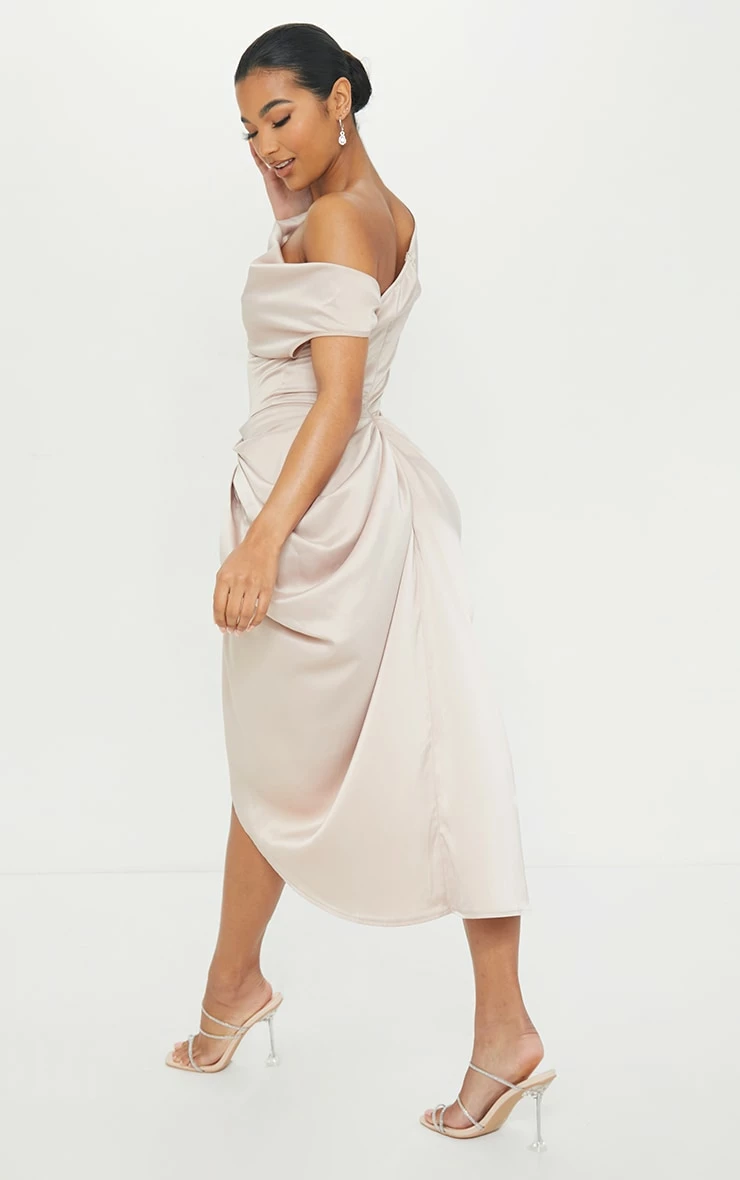 Get ready to have all eyes on you at your next event with this super luxe satin dress doll. Featuring a champagne hue satin material with a draped skirt design, an off-the-shoulder style and a midi length, we just can’t get enough. Perfect for any occasion, this champagne dress is bound to be your new favorite piece for the new season doll. Complete the look with heels and a glam bag for a look that will leave them speechless.