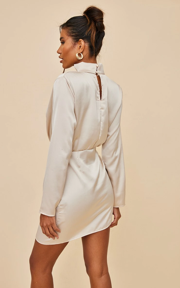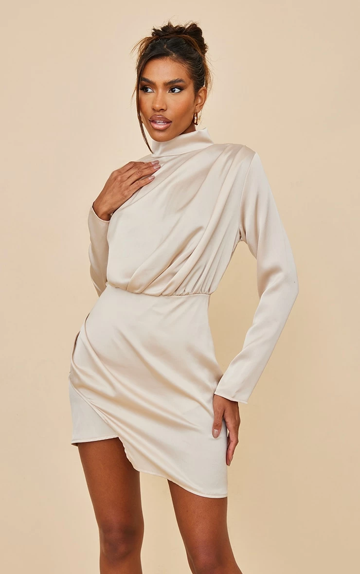 Be a showstopper this weekend with this bodycon dress doll. Featuring a champagne satin material with a high neck and draped skirt design. Style with gold heels and accessories for a foul-proof finish.