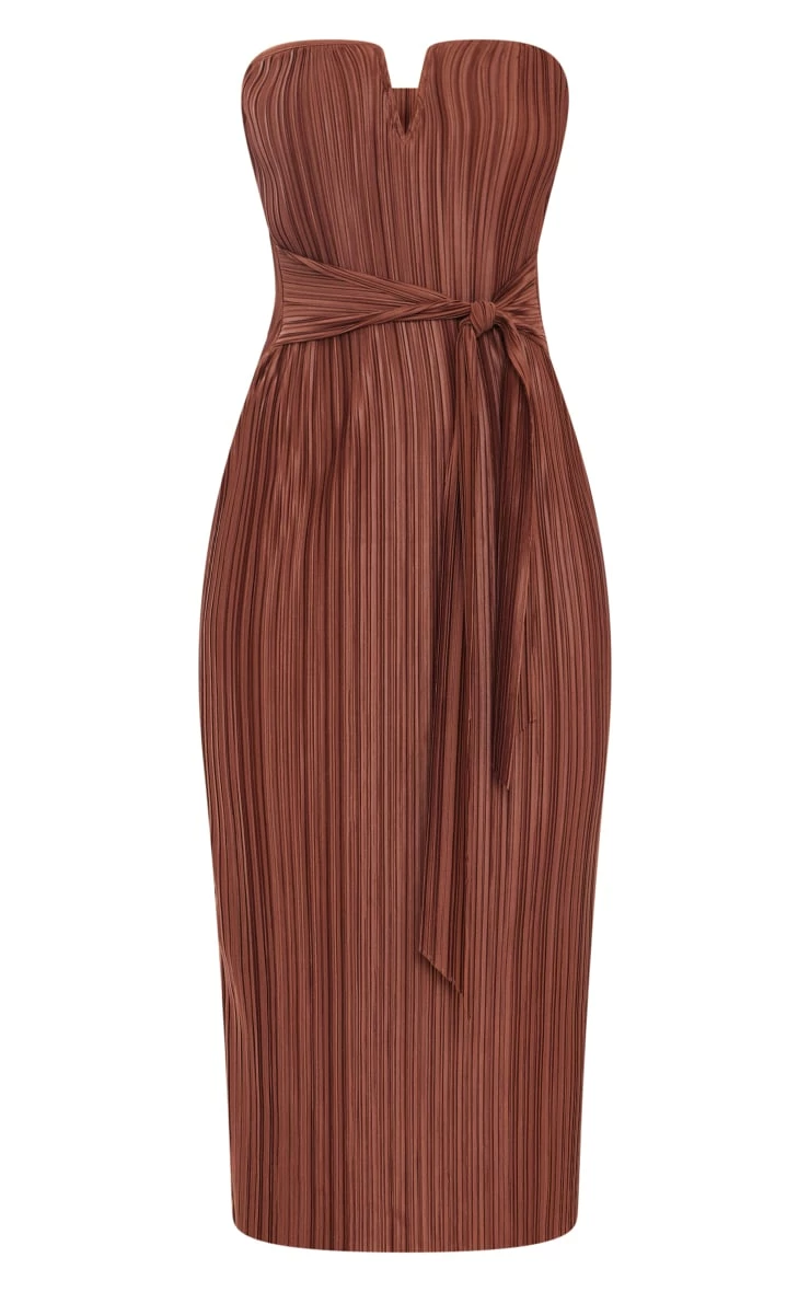Have heads turning for all the right reason with this unreal midi dress. Featuring a chocolate plisse material with a V bar design and a tie waist detail. Style with clear heels and a mini bag for a next level look.