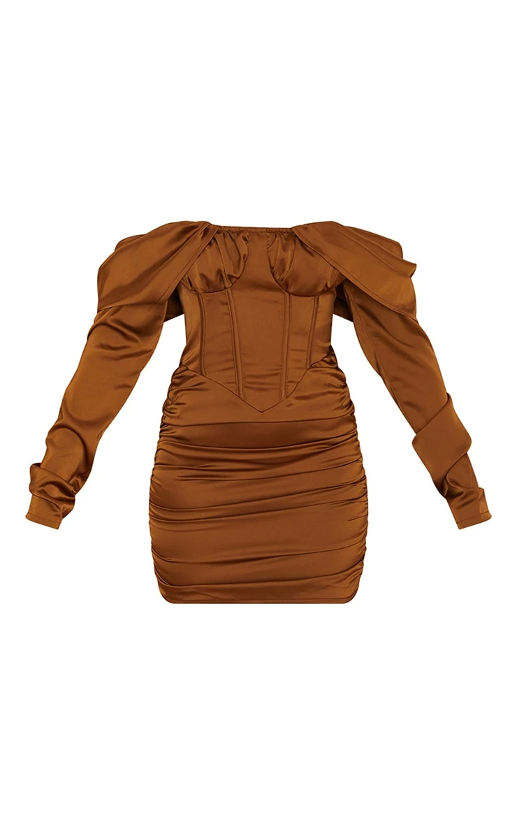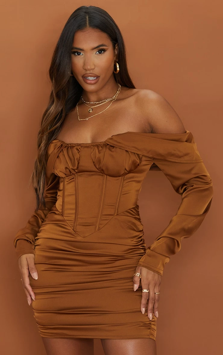 This dress is sure to have all eyes on you this weekend. Featuring a chocolate brown satin material with a bardot neckline, ruched detailing and a bodycon fit, we’re obsessed. Style this with gold heels and matching jewellery to complete the look.