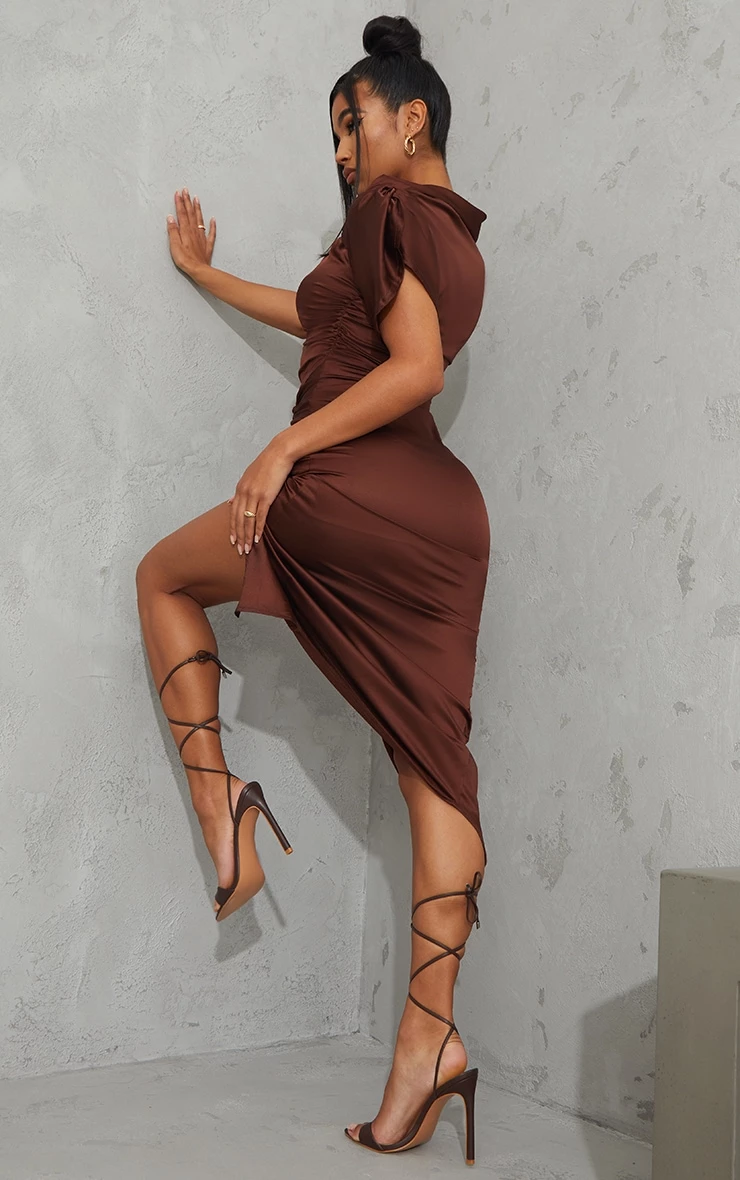 Upgrade your new season look with this chocolate midaxi dress doll, perfect for date nights or drinks out with the dolls. Featuring a chocolate hue satin material with short puff sleeves, ruched detailing, and a flattering cinched-in waist that hugs you in all the right places, we just can’t get enough. Just team this satin dress with a strappy heels, your go-to accessories for a chic look you can wear again and again.