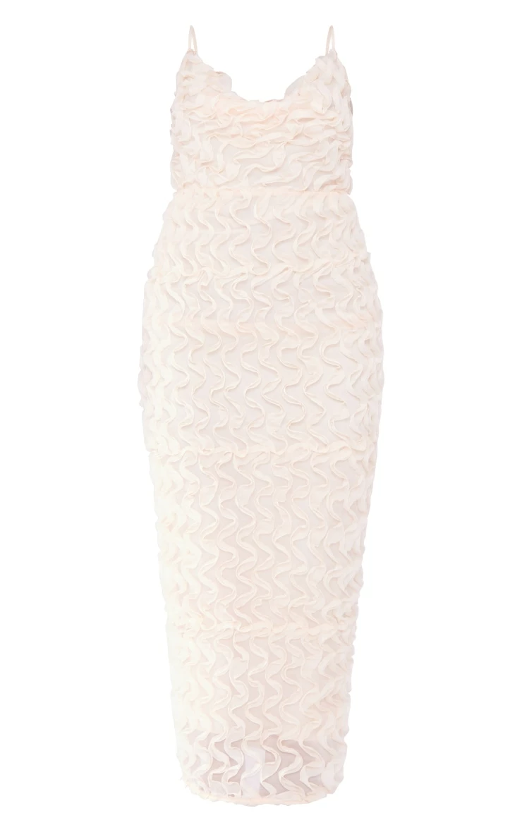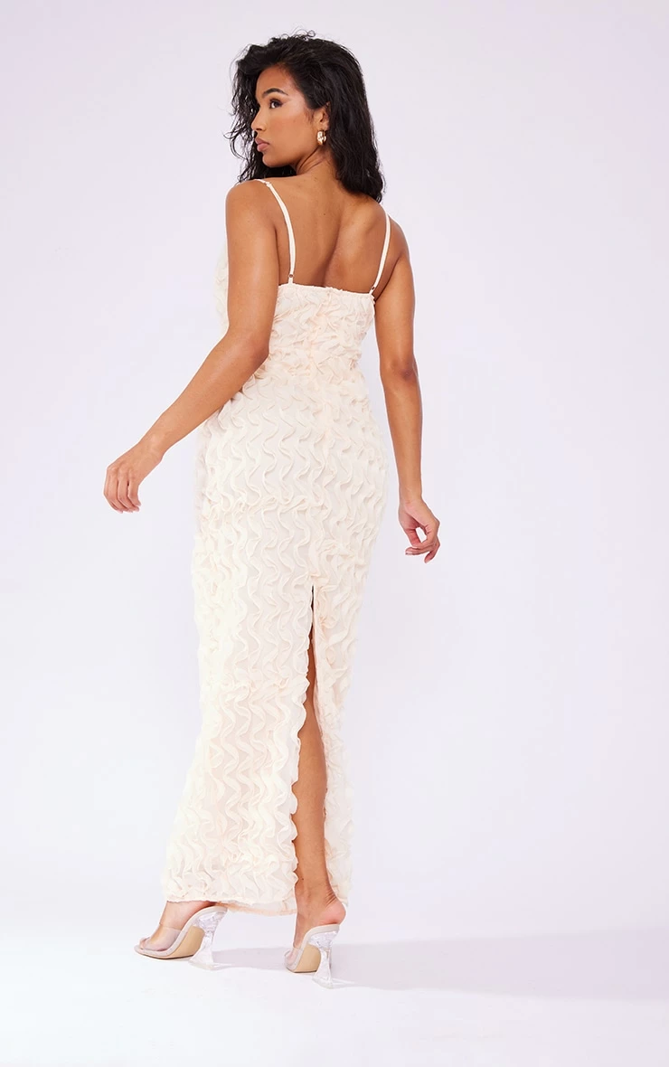 Add a touch of glam into your weekend wardrobe with this cream chiffon ruffle cowl strappy maxi dress. This maxi dress is brought to you in a cream chiffon material with ruffle detailing, a cowl neck, a strappy design and a maxi length, what more could you want? This maxi dress is here to banish any of your what-top-wear dilemmas doll. Simply style with clear high heels and accessories for a next-level look.