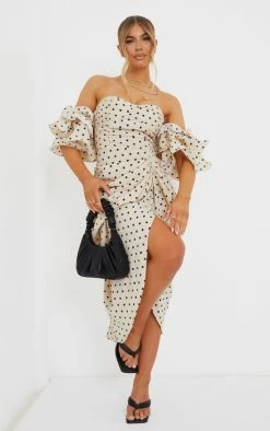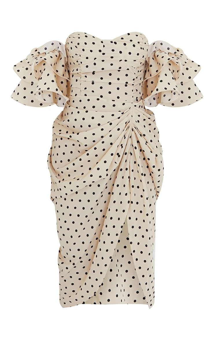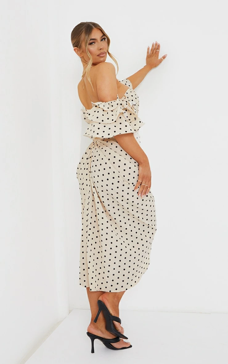 Add some polka dots to your new season wardrobe doll. Featuring a cream polka dot print material with a bardot neckline, frill sleeves and a draped design, team this dress with on trend mules for a weekend look we’re loving.