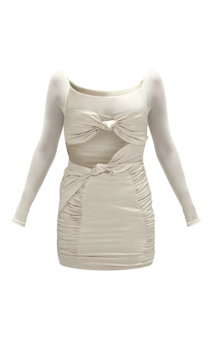 Get yourself a dreamy fit for this weekend doll and this bodycon dress is the one for you. Featuring a cream satin material with twist front detail and ruched side panels. Finish off this unreal look with simple accessories and heels so you are the centre of attention.
