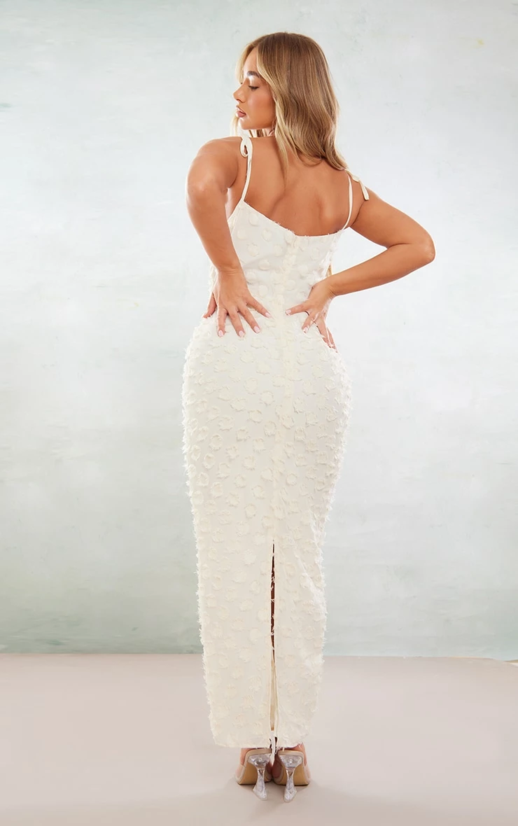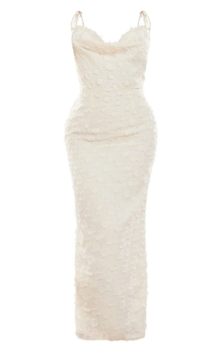 Channel all the dreamy vibes this weekend with this cream textured frayed detail strappy cowl neck maxi dress. Its cream textured material add a glam touch to your look and its cowl neckline is super flattering on your figure doll. This maxi dress is sure to tick all your dress code boxes for that upcoming special occasion and we know you won’t be able to say no. Style effortlessly with clear heels, gold accessories and a mini bag for a look that everyone will compliment.