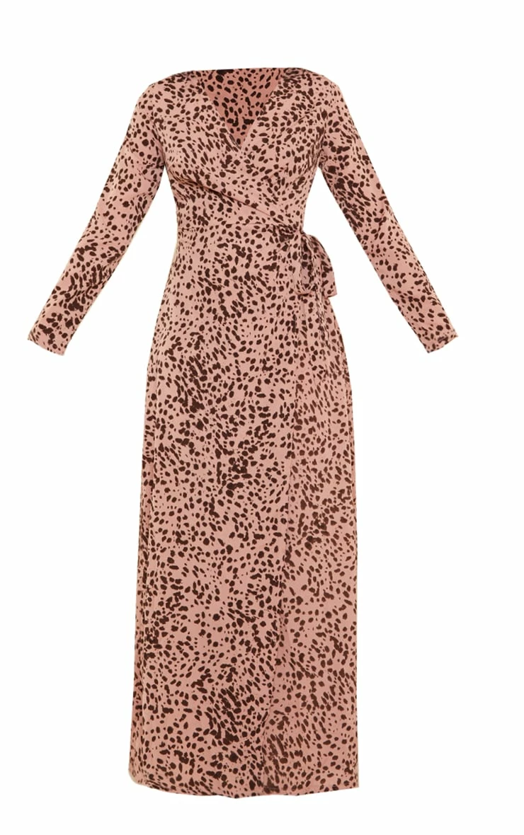 Keep your weekend vibe fiercely feminine with this dreamy dalmatian print maxi dress doll. Featuring a dusty pink material with a black dalmatian print, long sleeves, and a wrap-around style, we’re in love. This wrap dress is perfect for those who want to flater their figure in all the right places. A must-have for the new season, this long sleeve dress is is one you can wear again and again. Just add tonal strappy heels and a purse to complete the look.