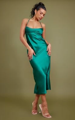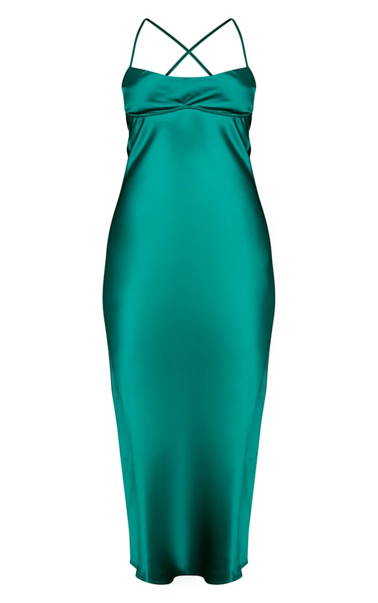 Looking for the perfect occasion fit? We’ve got you covered with this emerald green satin underbust cross back midi dress. Seriously chic and sure to have everyone looking your way, we are obsessed. In a emerald green hue satin material with an underbust design, cross back detailing and a figure-flattering midi length, how could you not fall in love with this dress doll? Just add clear strap heels and some glam accessories to completely elevate the look.