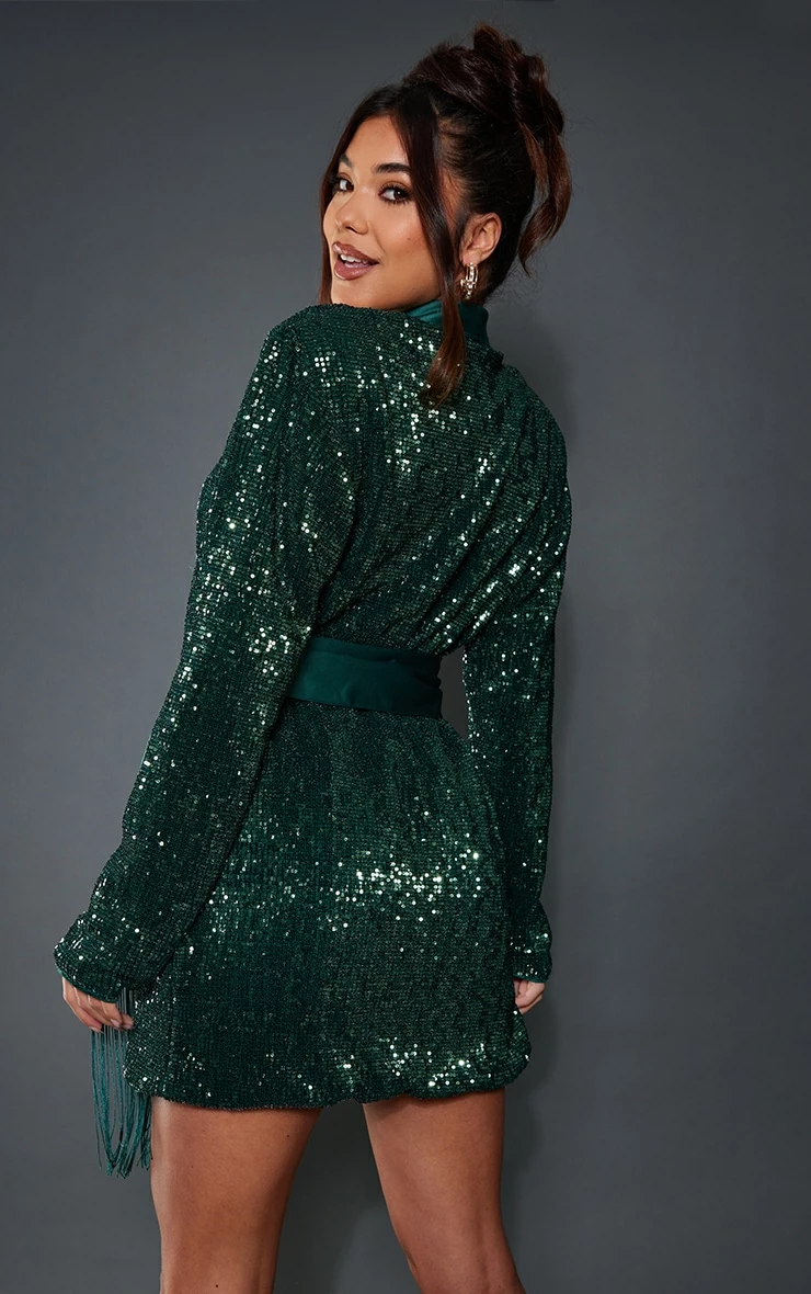 Add some chic vibes to your weekend wardrobe with this blazer dress. Featuring an emerald green hue, a sequin material and a tassel tie detail. Pair with your go-to clear heels and some chunky gold hoops to complete the look.