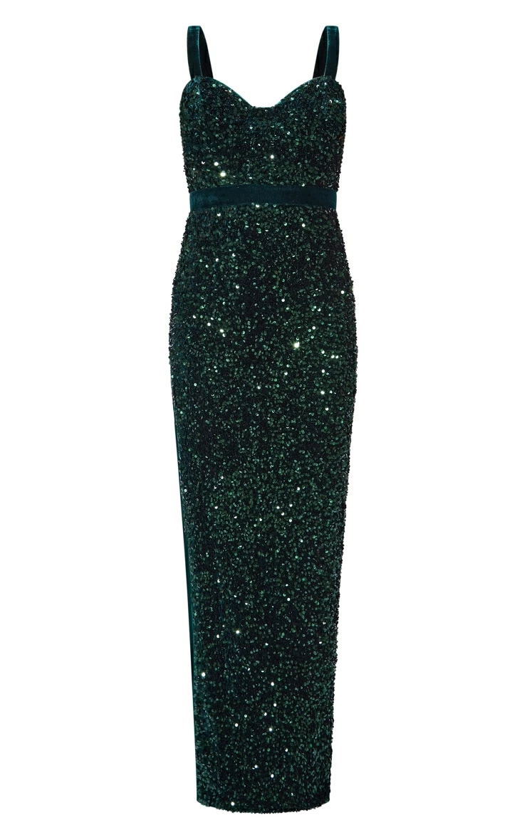 Take your weekend look to a level never reached before in this dreamy dress doll. Featuring an emerald green sequin velvet material in a bandeau style and a maxi length, we’re in love. Style with your trusty high heels and accessories for a fool proof finsih.