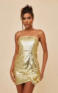 Make a statement this season with this bodycon dress doll. Featuring a gold sequin material with a bandeau neckline and a bow detail. Go for a full glam finish with gold heels and earrings to complete the look.