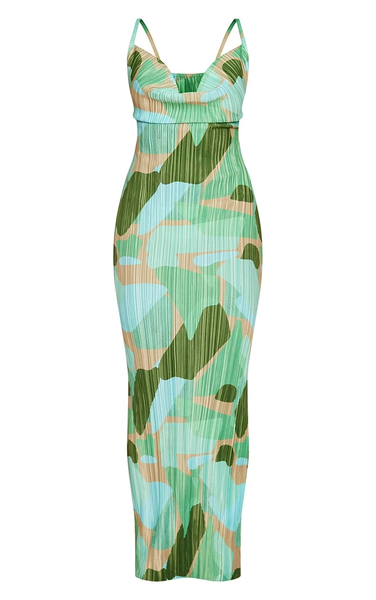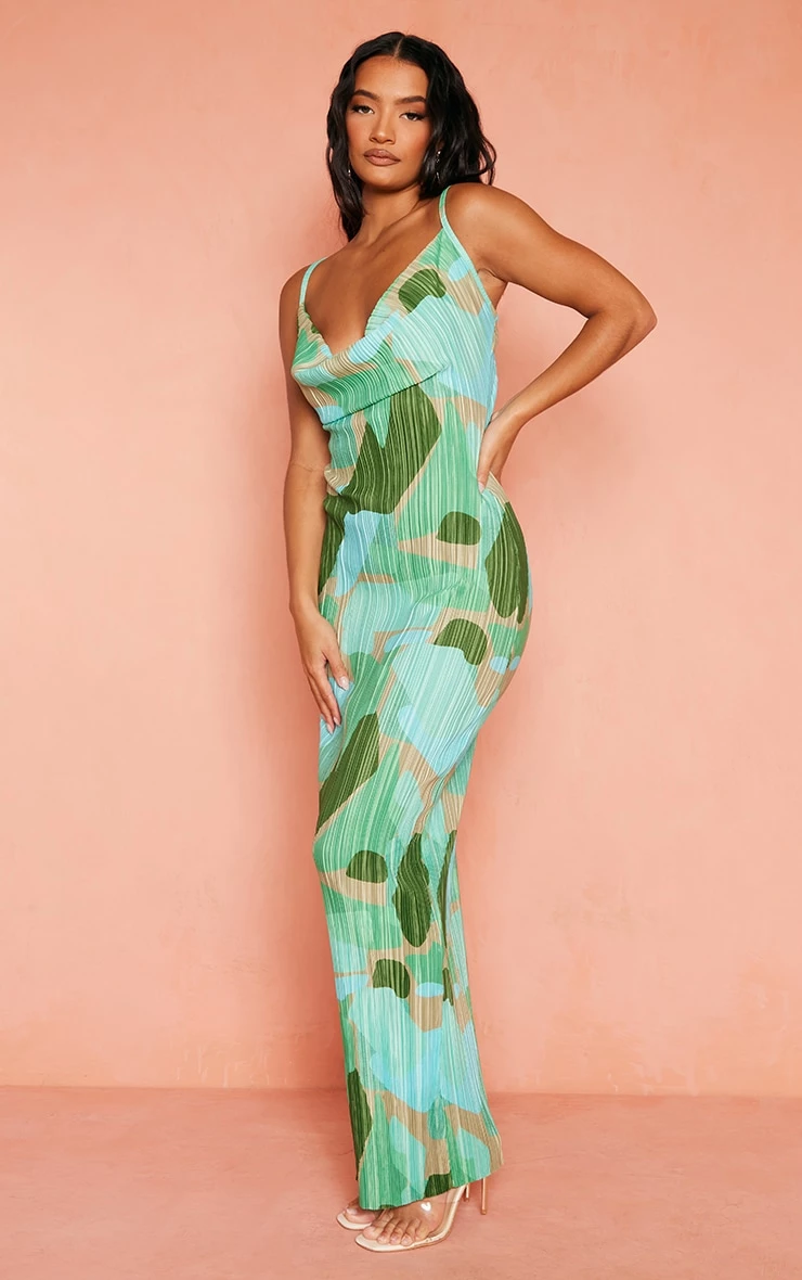 Get occasion-ready with this dreamy dress. Featuring a green abstract printed plisse material with thin straps and a maxi length, we are in love. Style with clear heels and a clutch bag to keep all eyes on you.