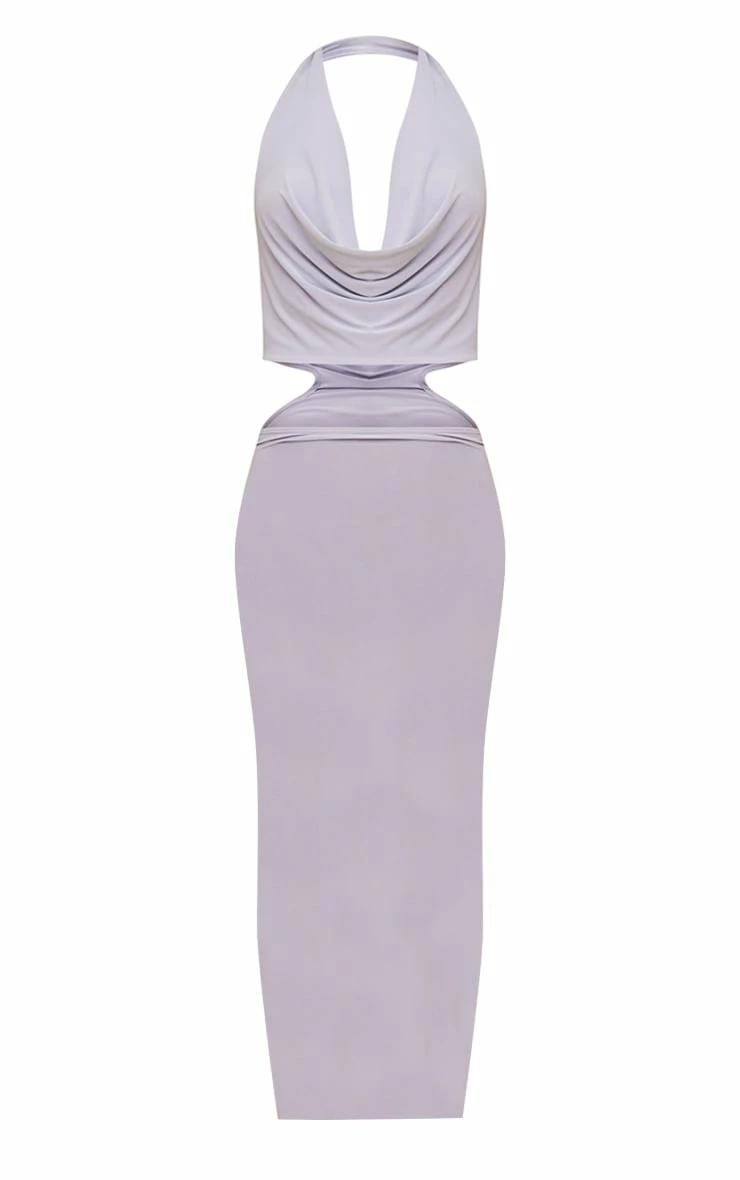 Let your glam side shine through with this eyecatching midi dress. Featuring a grey slinky material with a cowl neck, a cut out and a flattering fit, we are so in love. Wear with high heels, simple accessories and a mini bag for an extra touch of luxe.
