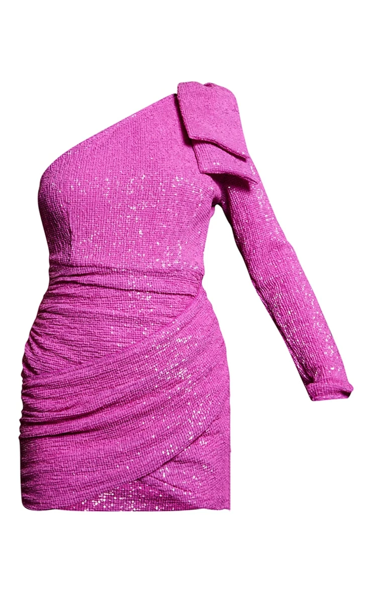 Keep your weekend vibe fiercely feminine with this dress. Featuring a hot pink hue with a sequin material and a one-shoulder bow detail. Team with some similar hue platform heels for a look that will get heads turning this season.