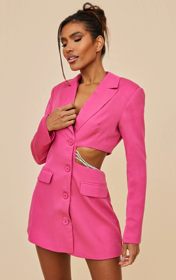 Get maxing out your wardrobe with this blazer dress. Featuring a hot pink material with a side cut out design and a diamante strap detail. Team with your fave heels and accessories for your choice for a look that is sure to get heads turning.