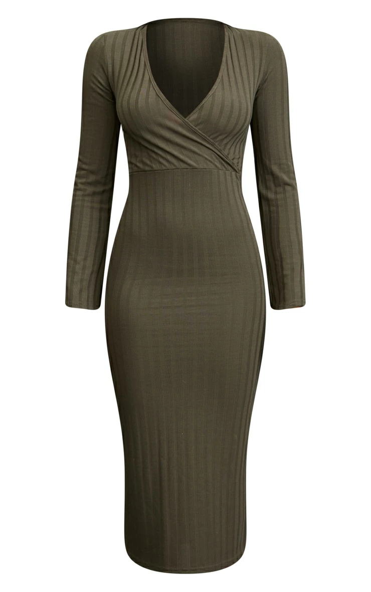 Switch up your off-duty wardrobe with this khaki rib wrap midi dress with flared cuff. Its khaki rib material is perfect for an everyday look whilst its wrap design gives it a little added edge. This midi dress has a plunging neckline and flared cuff sleeve which helps turn up the heat for a weekend look as well. For a more chilled vibe, add box-fresh sneakers and a matching hue aviator jacket.