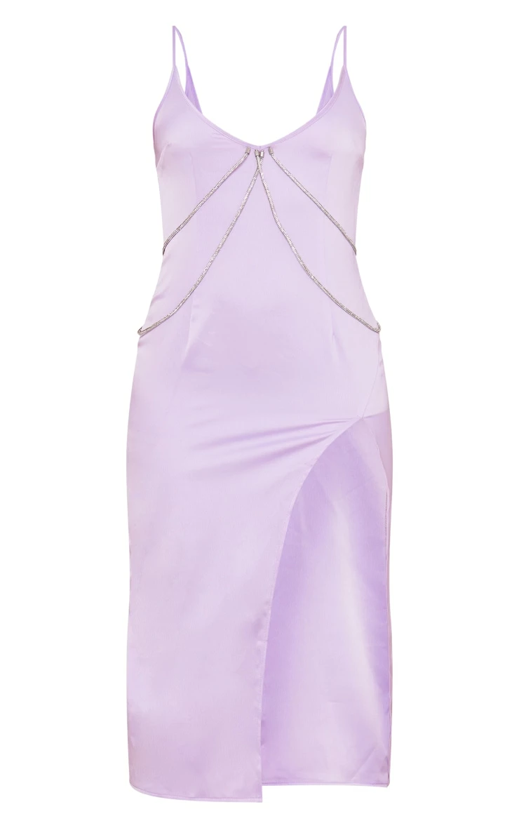 Turn heads for all the right reasons in this statement dress. Featuring a lilac satin material with a diamante drape detail, a strappy design and a midi length, we’re in love. Wear with pink high heels, silver accessories and a mini bag for a date night with the dolls.