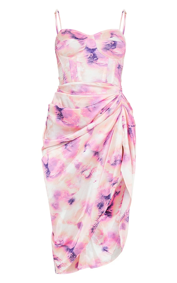 This dress is sure to steal all the stares doll. Featuring a lilac tie-dye print satin material with corset detail and a ruched midi skirt. We love this teamed with mules and a clutch bag for a statement look.