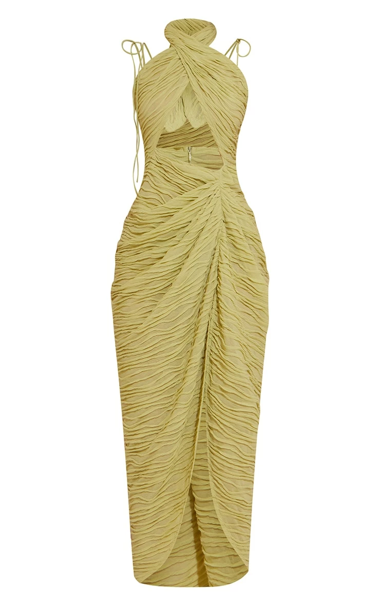 Add a luxe feel to your weekend look with this midi dress doll. Featuring a lime textured material with a cross-over design, drape detailing and tie fastening, what more could you want? Wear with an orange mini bag and strappy heels to take the look the extra mile.