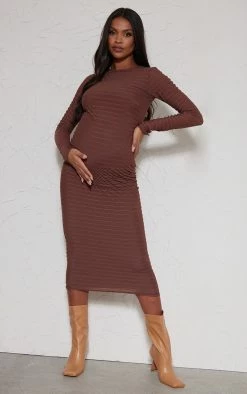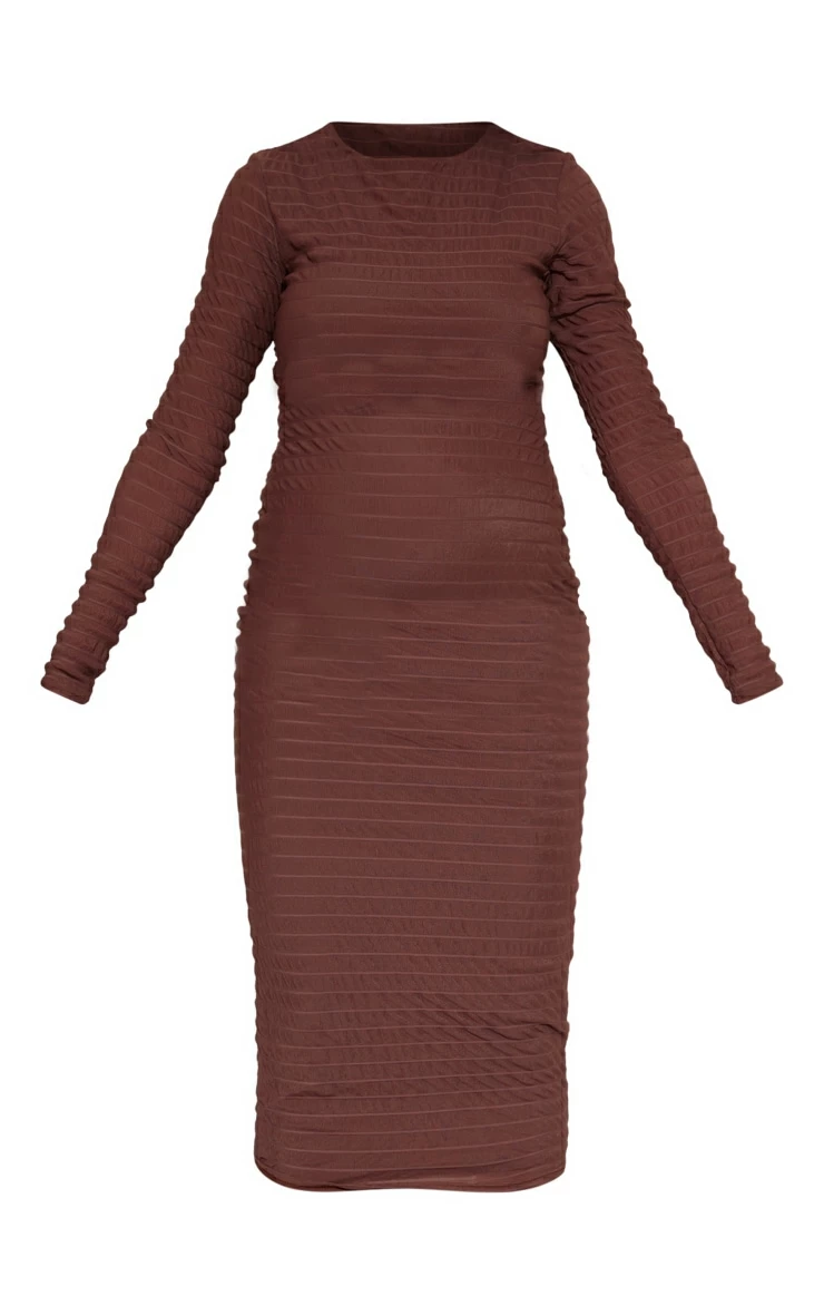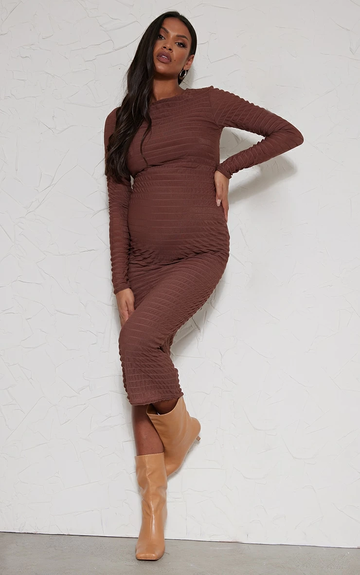 Get ready to look all kinds of glam with this maternity chocolate shirred long sleeve midi dress. This dress is the perfect piece for effortless day to night styling. It features a chocolate hue shirred material with long sleeves and a midi length, you’re sure to be in love. Wear with heeled boots and your fave accessories for a date with the dolls or add box fresh kicks for the perfect everyday fit.