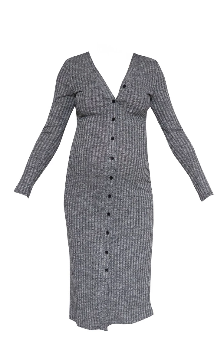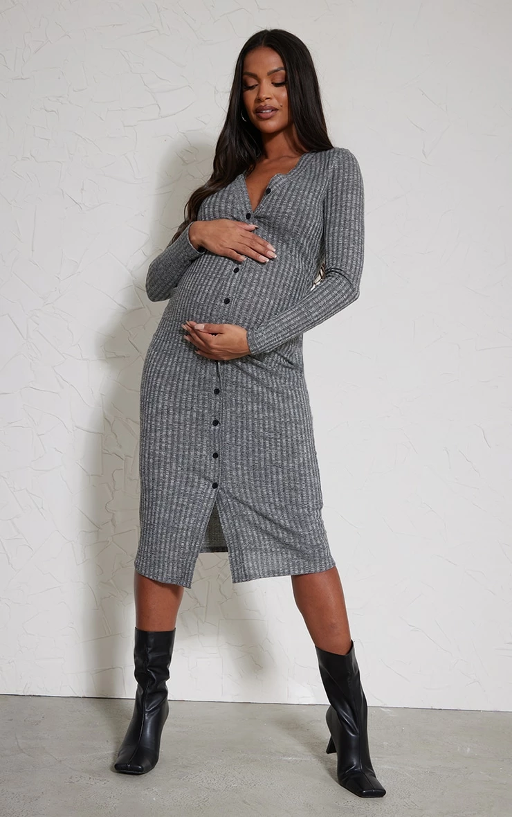 Add some seriously chic vibes to your new season wardrobe with this dress. Featuring a dark grey soft ribbed material with long sleeves and a midi length. Pair with heeled boots and simple accessories for a look we’re obsessing over.