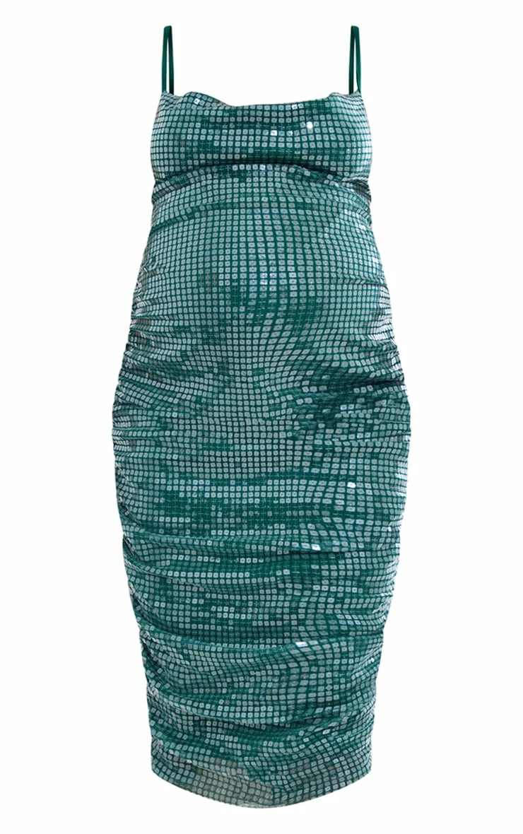 Brighten up the room with this dreamy dress. Featuring an emerald green sequin material with a cowl neck, we’re in love. Wear with your dreamy high heels and gold accessories to finalise the look.