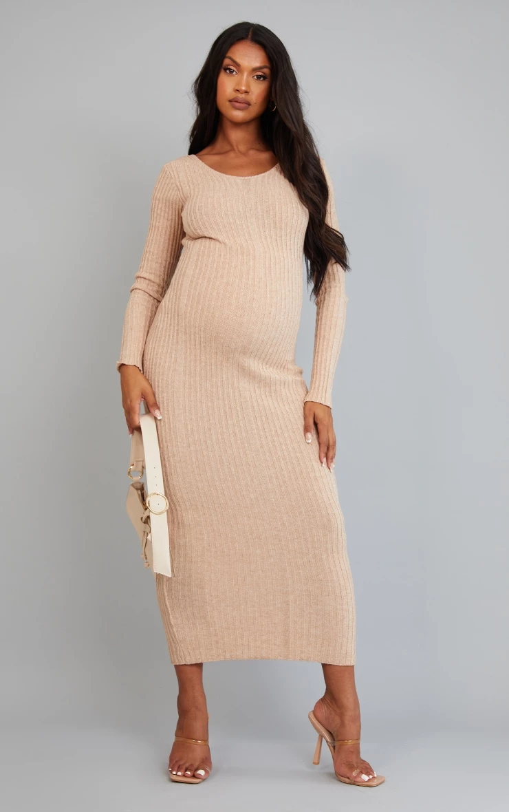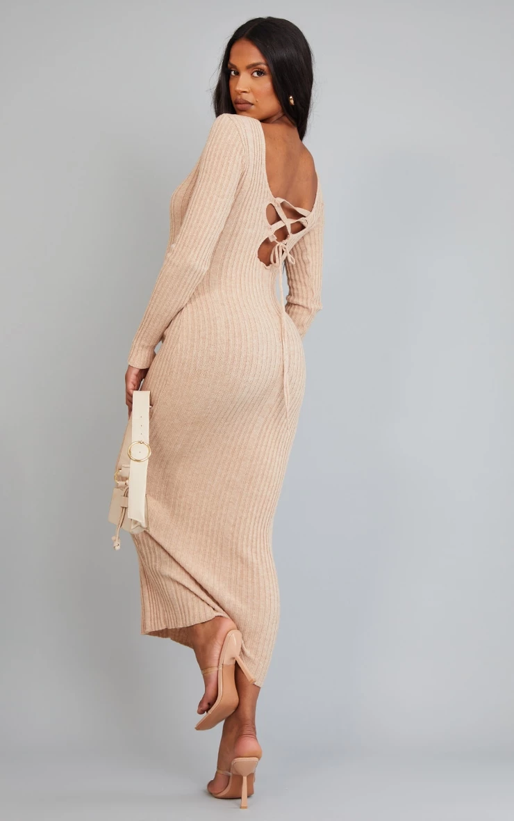 Make styling simple with this dress doll. Featuring an oatmeal hue knitted material with a tie back design and a midaxi length, we’re obsessed. Style with heels and your fave accessories for an effortless weekend look.