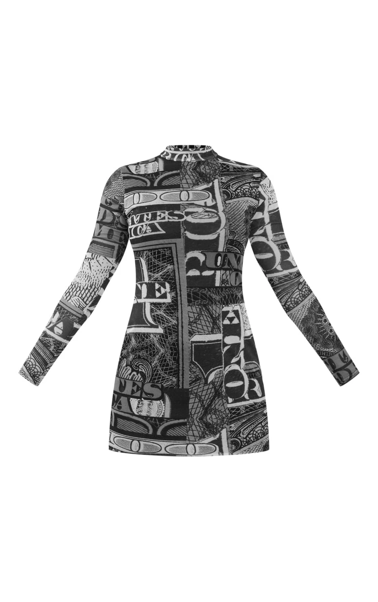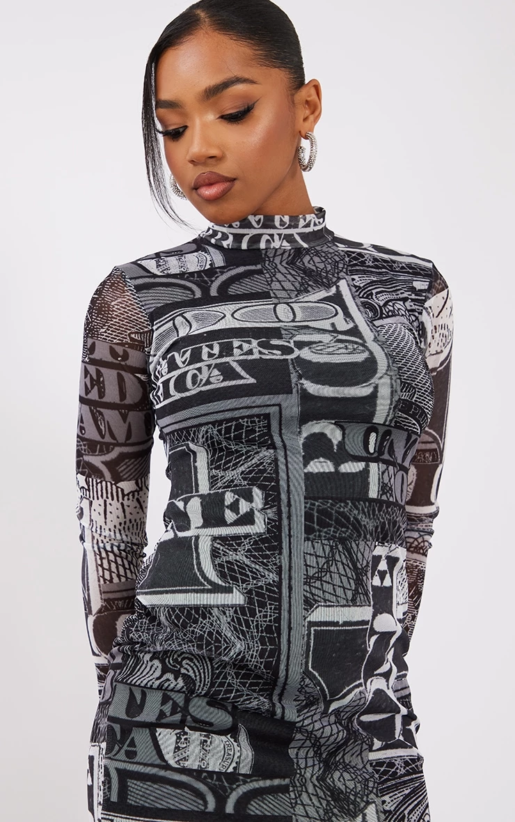 This statement bodycon dress is sure to earn you all the likes. Featuring a monochrome money print mesh material with a ruched sleeve design and a figure-worshipping fit, we are beyond obsessed. Wear with knee-high boots, accessories and a mini bag to secure the vibe.