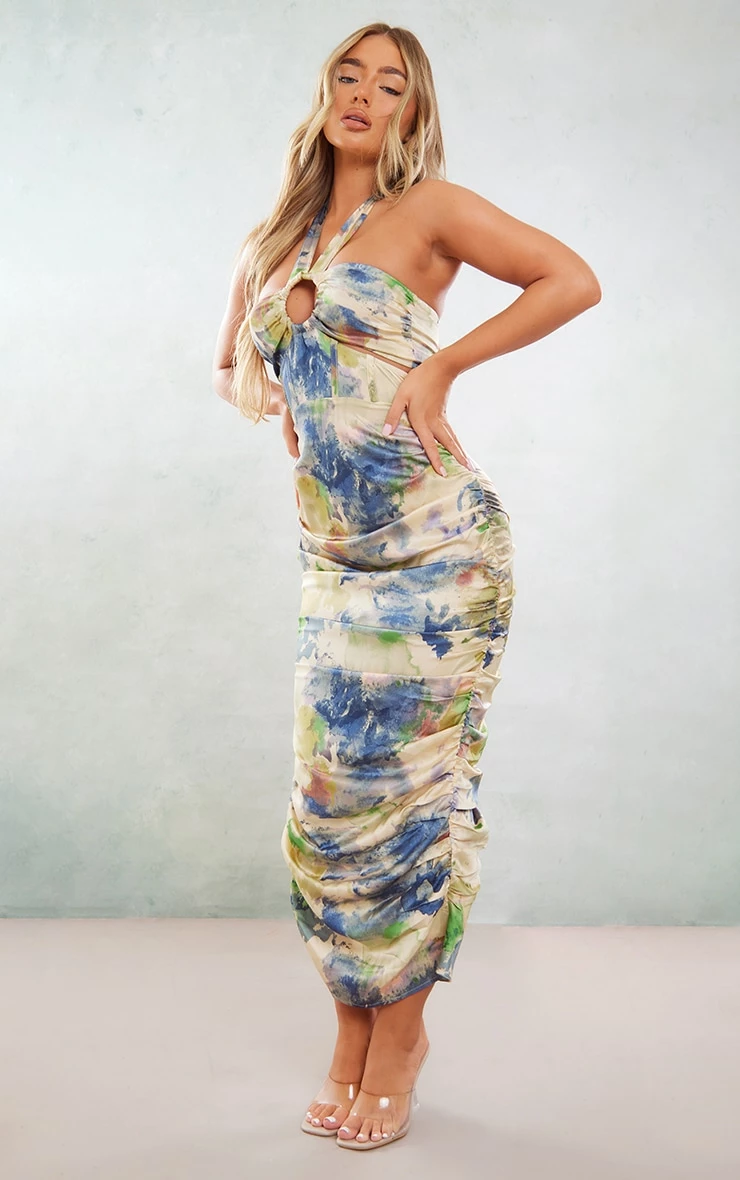Channel all the chic vibes this weekend with this multi abstract print satin ring corset detail midaxi dress. Its multi abstract print satin material adds those glam feels that will nail any dress code as well as a ring detail halter neckline and corset design, what’s not to love? Take your look to the next level with clear heels, gold accessories and a mini bag.