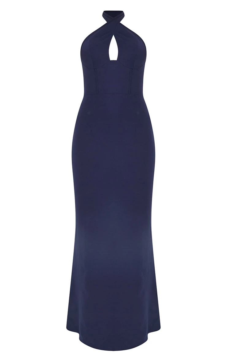 Have all eyes on you at your next big occasion with this maxi dress. Featuring a navy material with a corset detail and a cross front design, team this dress with clear heels and complete the look with statement earrings.