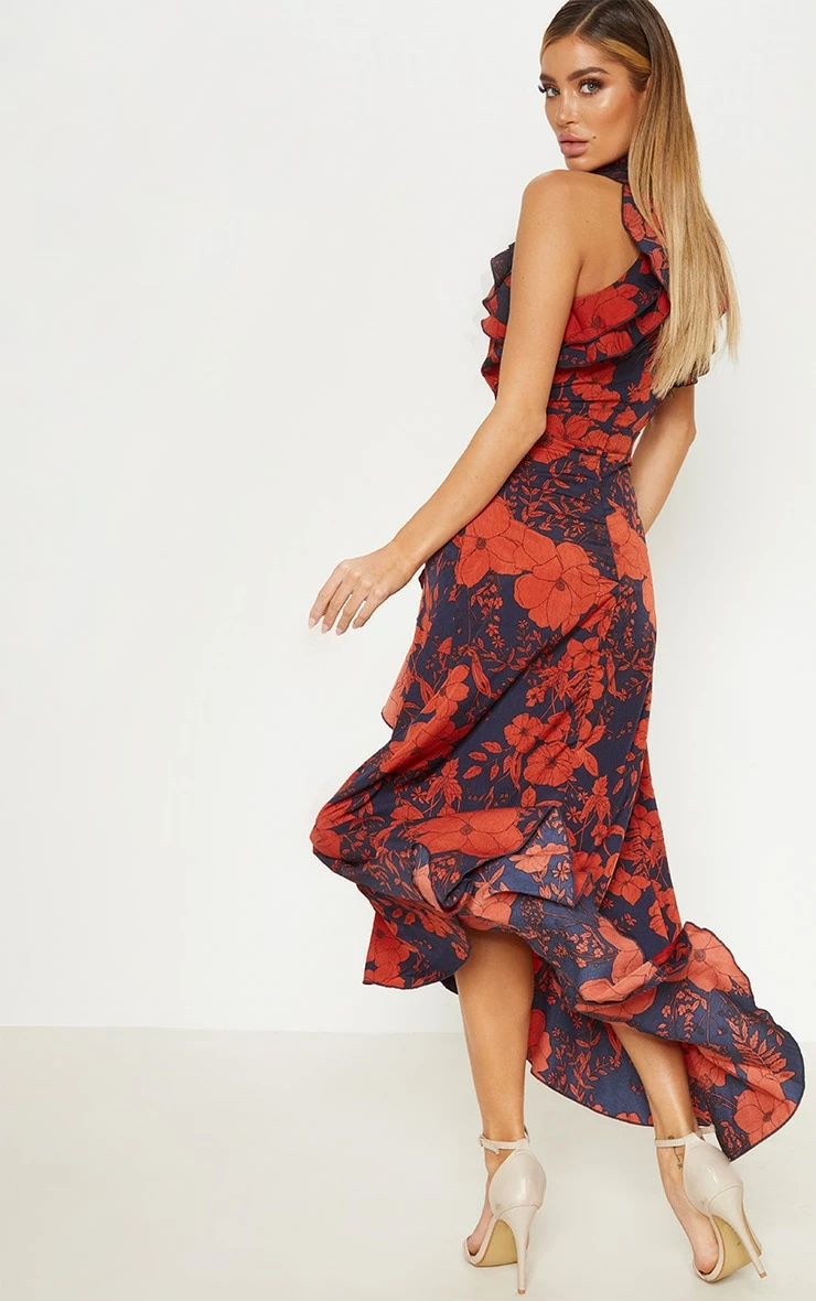 We are obsessing over all things floral right now and this maxi dress is at the top of our hit-list! Featuring a navy floral print with frill trims and hem and a wrap design, what’s not to love? Finish off the look with strappy heels and a cute clutch for a look we’re loving.