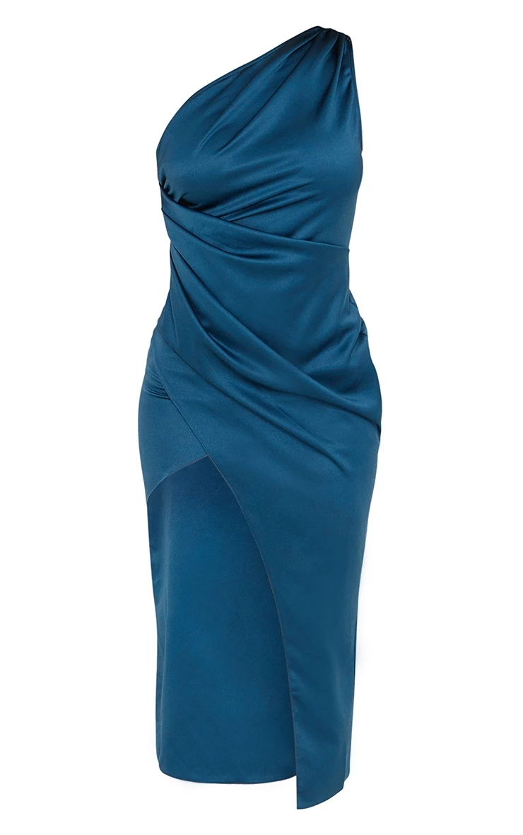 This midi dress is sure to get heads turning doll. Featuring a navy blue satin material with a one-shoulder design, pleat detail and a midi length. Pair this with barely-there heels for your next big event.