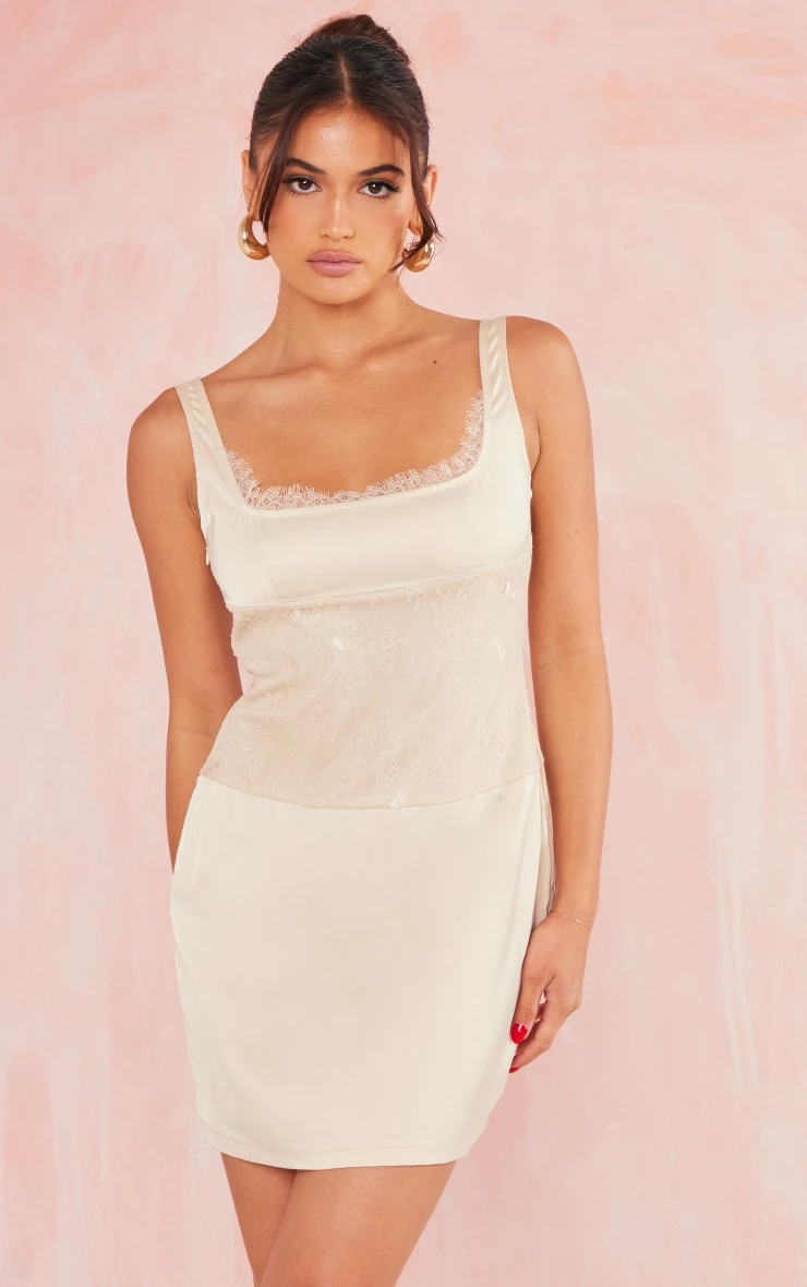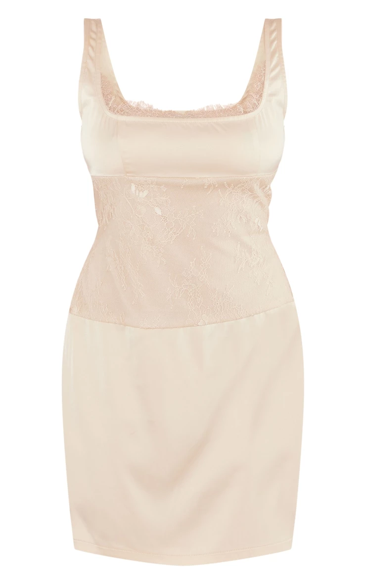 Be the center of attention in this nude satin lace insert trim detail strappy bodycon dress. This dress is brought to you in a nude satin material with a lace trim detail that will have you feeling effortlessly chic this season. With its strappy design and bodycon fit, you will be showing off your shape in all the right places. Simply style with a pair of strappy heels and your go-to gold hoops to finish off the look everyone is talking about.