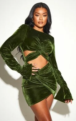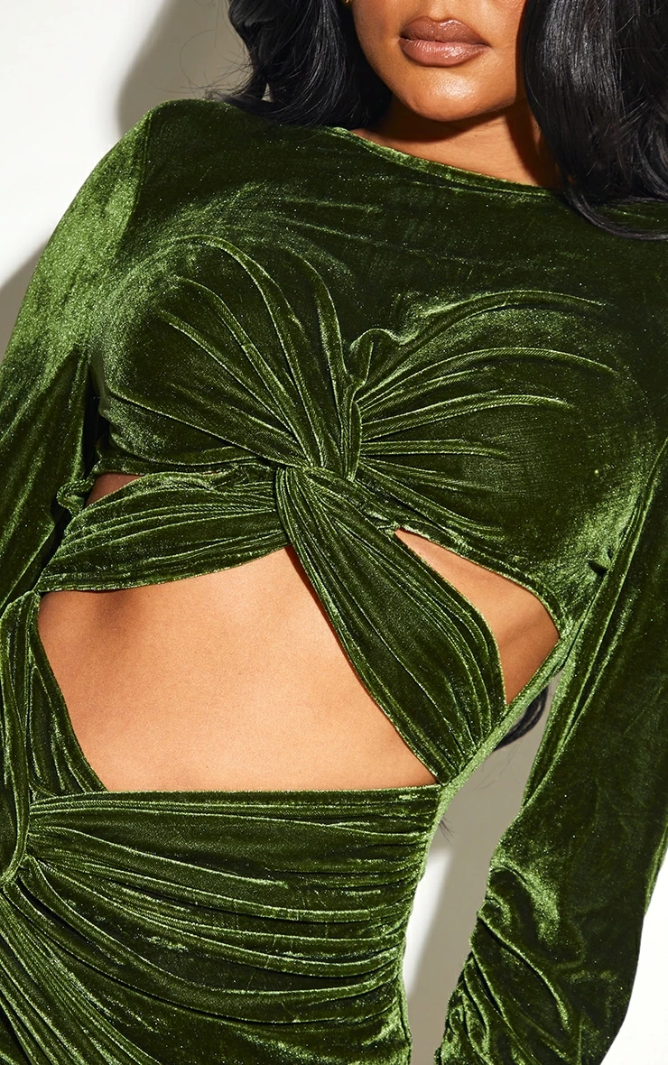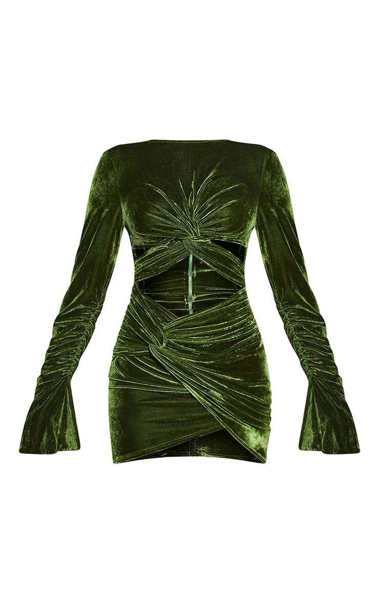Your weekend fit is finally sorted with this dress doll. Featuring an olive hue velvet material with ruched sleeves and a cut out design. Style with tie-up heels and a clutch bag for a dreamy date night look.