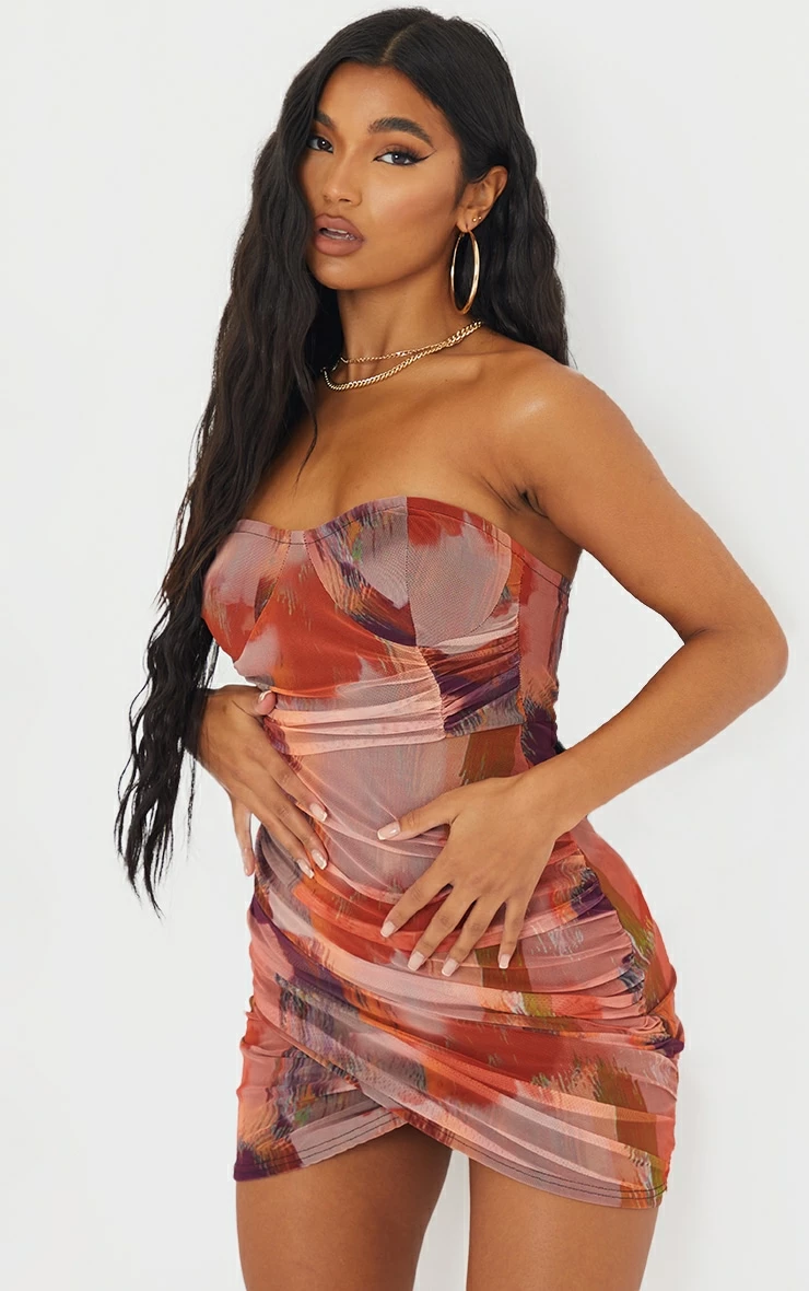We are obsessing over this bodycon dress which is essential for your weekend wardrobe. Featuring an orange material with an abstract print, a flattering bandeau neckline and ruched detailing. Style with tie-up heels, clutch bag and gold accessories to complete the look.