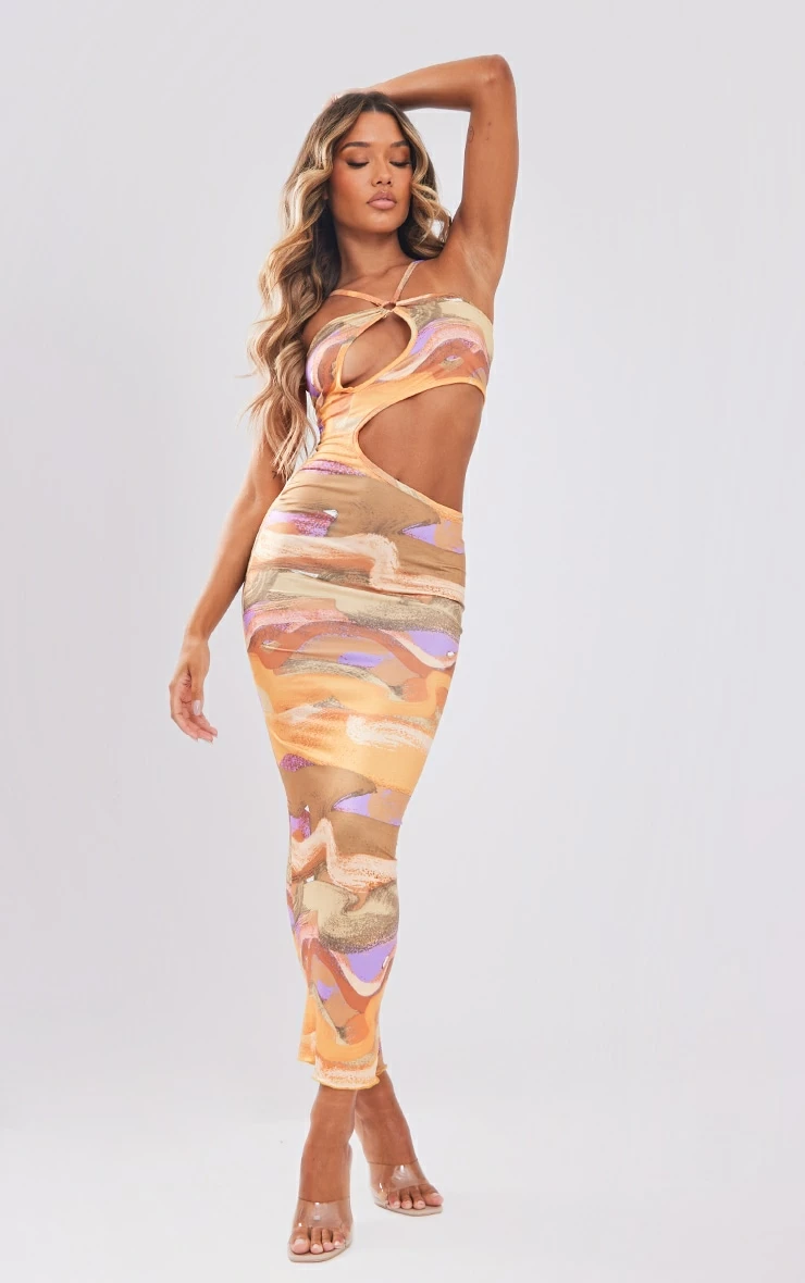 Get your glam on with this orange abstract print slink ring detail cut out maxi dress. This statement maxi dress is made from an orange abstract slinky print material with ring detailing and a cut-out design, you’re sure to have all eyes on you. When the weekend calls so does this women’s cut-out maxi dress. So what are you waiting for? Shop the look and opt for clear high heels and gold accessories for a look that we can’t stop crushing on.