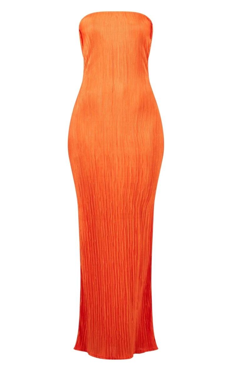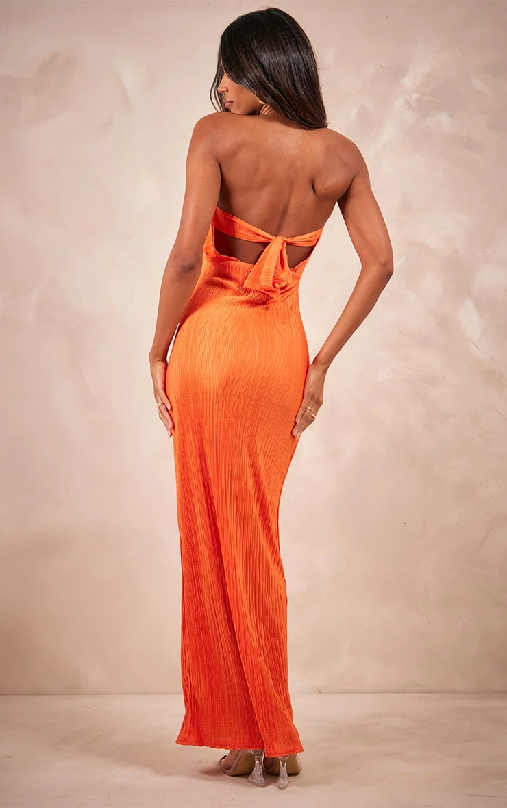 Turn up the heat this weekend with this orange plisse bandeau cowl-back maxi dress. Its orange plisse material adds all the luxe vibes to your look whilst its cowl back design with tie fastening gives you that seriously glam touch. This maxi dress is just what you need to have all the eyes on you this weekend. Style effortlessly with your fave heels, gold accessories and a mini bag for a look that everyone will love.