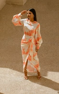 Make a serious style statement in this maxi dress. Featuring an orange watercolour print material with a tassel tie detail and wrap front design. We love this styled with heels to complete the look.